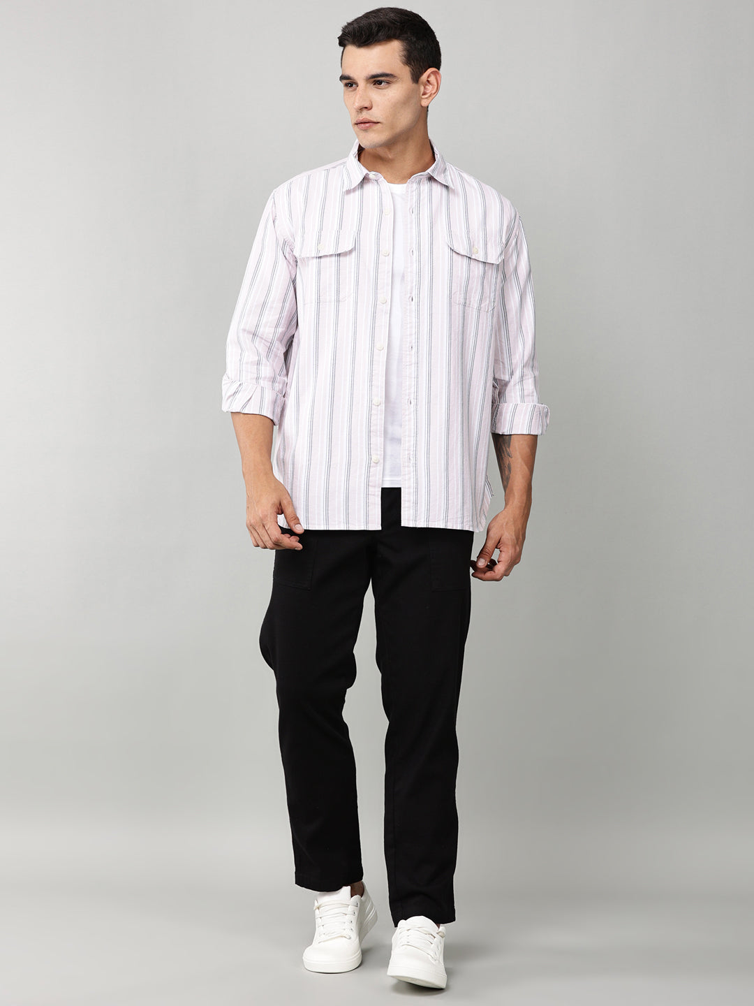 The ENOVATE Slate Stripe Double Pocket Shirt is a refined essential, featuring a crisp vertical stripe design in soft slate grey and clean white. Tailored in a relaxed fit, this shirt offers breathable comfort with subtle structure, thanks to its double chest pockets and button-down closure.