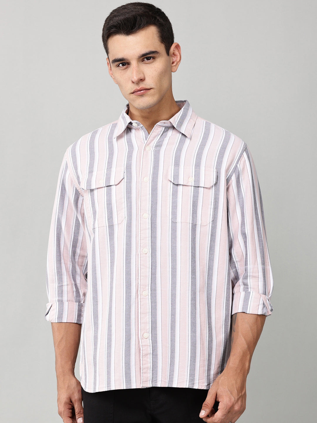 The ENOVATE Taupe Striped Double Pocket Shirt redefines casual style with its effortless blend of soft blush pink, white, and taupe-grey vertical stripes. Crafted in a relaxed silhouette, this breathable shirt offers both comfort and structure with double chest flap pockets and full button-down detailing.